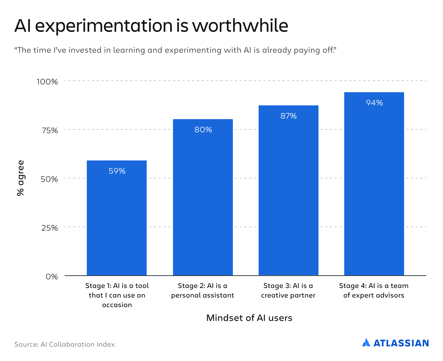 Nearly all of Stage 4 AI collaborators (94%) agree that the time they spend learning to work with AI pays off, compared to just 59% of Stage 1 AI users.