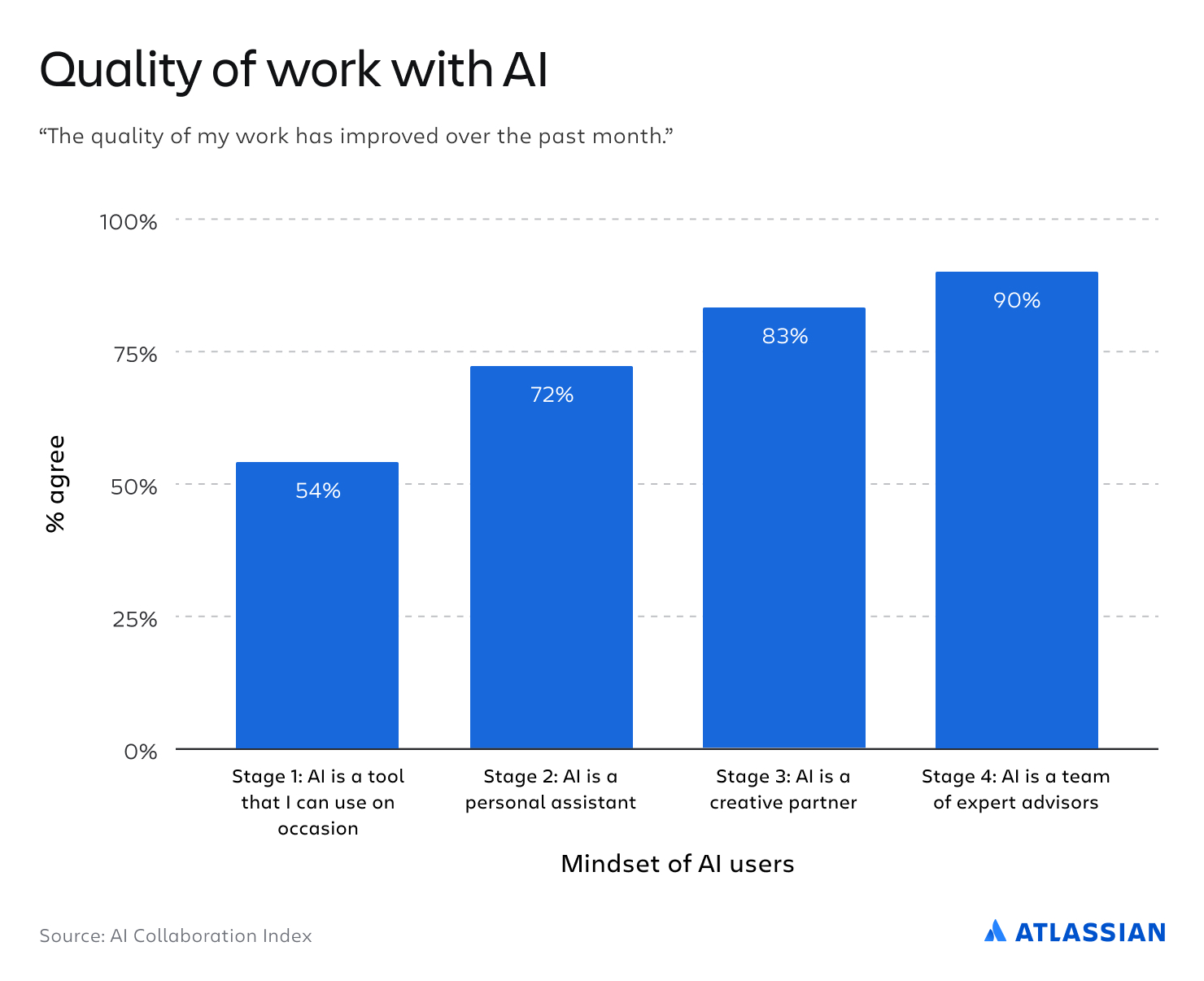 - In contrast, a large majority (85%) of strategic AI collaborators (Stage 3 and 4) agreed that “The quality of my work has improved over the last month.”