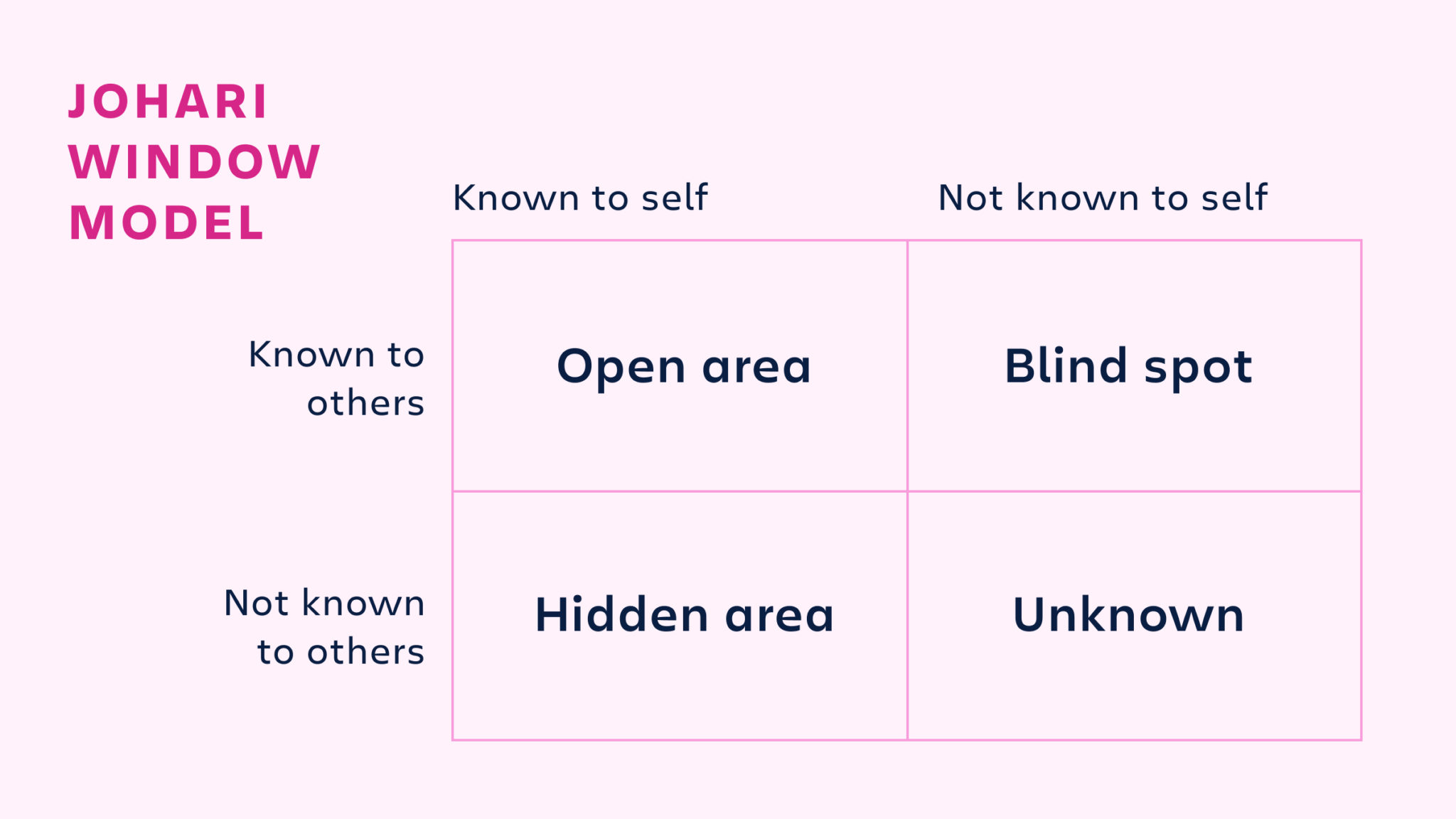 To try this model, review a list of adjectives, and choose five or six terms that best describe you. Then, your colleagues would do the same, choosing the descriptors they think fit you best. Finally, plot each list on a four-quadrant matrix, which will look like a window with four panes (hence the “Johari window” moniker).