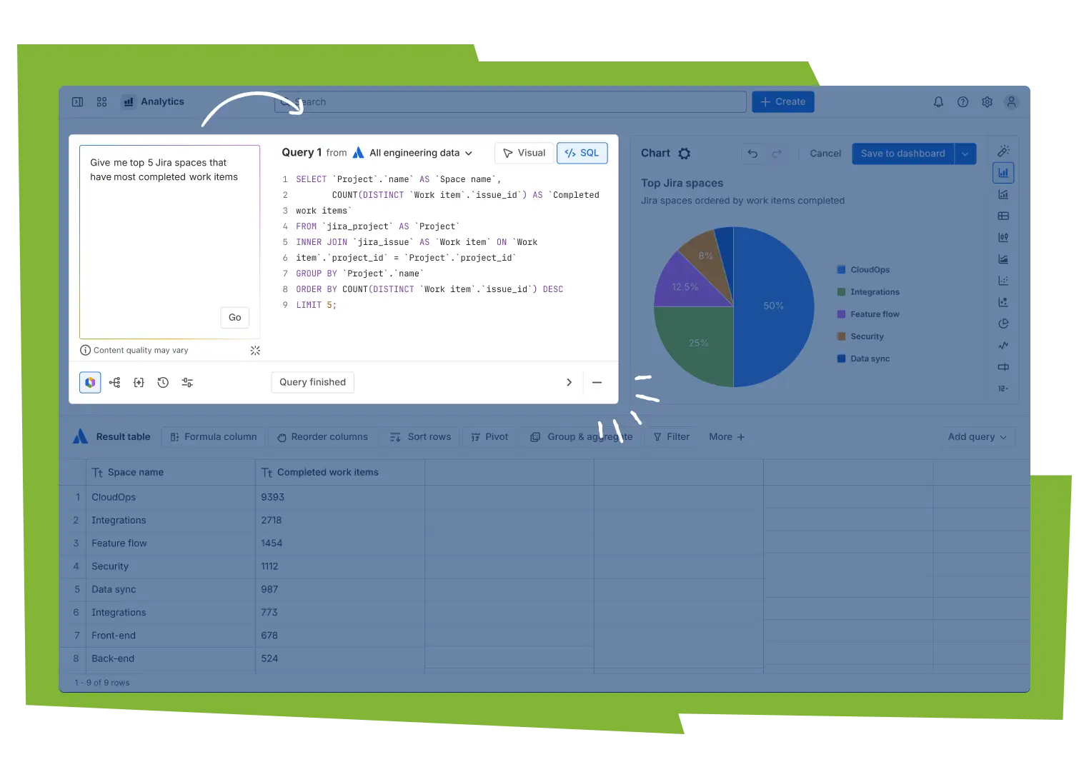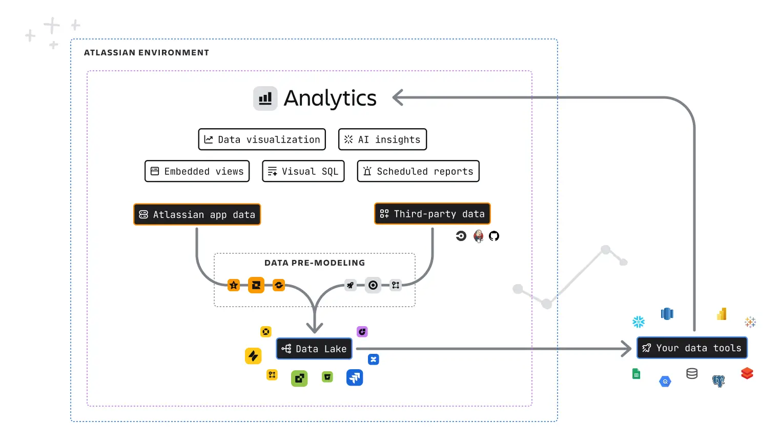 S'appuyant sur un Data Lake prémodélisé, Analyses vous permet de passer moins de temps à préparer les données et plus de temps à explorer les informations, grâce à des données unifiées et gérées provenant de vos applications Atlassian et tierces.